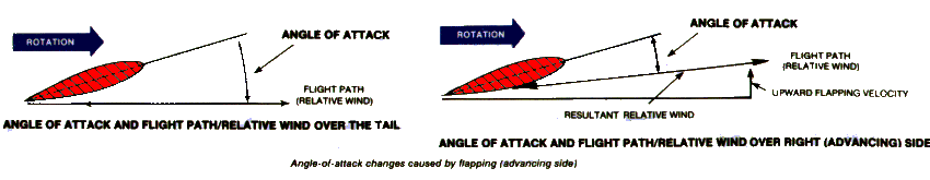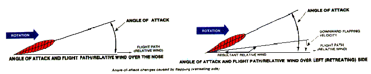 From the above graphic it may be seen that the relitive wind created by the helicopter's forward flight causes angle of attack differences between the front and rear of the rotor. The blade over the nose of the helicopter experiences an increase in angle of attack because the aircraft relative wind approaches the blade level with or below its span. The blade over the rear of the helicopter experiences a reduced angle of attack because the aircraft relative wind approaches it from above.