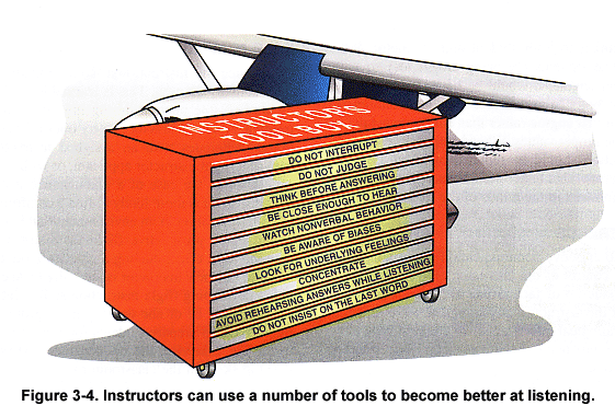 Listening is more than hearing. As mentioned earlier, it is important for students to be able to hear the radio and the instructor. But simply hearing is not enough. An example of hearing that is not listening would be a pilot acknowledging instructions from the tower, but then having no idea what the tower operator said. When calling back to the tower to get the information, the pilot will want to hear what is being said and will be more inclined to do a better job of listening. This time the pilot must be ready to listen and be responsible for listening. Otherwise, communication will fail again. Students also need to be reminded that emotions play a large part in determining how much information is retained. One emotional area to concentrate on is listening to understand rather than refute. An example is the instrument student pilot who anticipates drastic changes in requested routing and is already upset. With this frame of mind, it will be very difficult for the student to listen to the routing instructions and then retain very much. In addition, instructors must ensure that students are aware of their emotions concerning certain subjects. If certain areas arouse emotion in a student, the student should be aware of this and take extra measures to listen carefully. For example, if a student who is terrified of the prospect of spins is listening to a lesson on spins, the emotions felt by the student might overwhelm the attempt to listen. If the student, aware of this possibility, made a conscious effort to put that fear aside, listening would probably be more successful. |