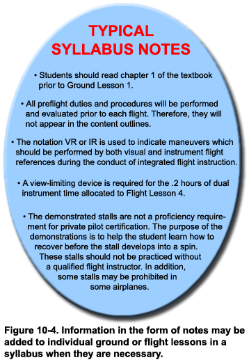 A syllabus lesson may include several other items that add to or clarify the objective, content, or standards. A lesson may specify the recommended class time, reference or study materials, recommended sequence of training, and study assignment for the next lesson. Both ground and flight lessons may have explanatory information notes added to specific lessons.
