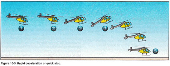 In normal operations, use the Rapid Deceleration or Quick Stop maneuver to slow the helicopter rapidly and bring it to a stationary hover. The maneuver requires a high degree of coordination of all controls. It is practiced at an altitude that permits a safe clearance between the tail rotor and the surface throughout the maneuver, especially at the point where the pitch attitude is highest. The altitude at completion should be no higher than the maximum safe hovering altitude perscribed by that particular helicopter's manufacturer. In selecting an altitude at which to begin the maneuver, you should take into account the overall length of the helicopter and its height-velocity diagram. Even though the maneuver is called a rapid deceleration or quick stop, it is performed slowly an smoothly with the primary emphasis on coordination.