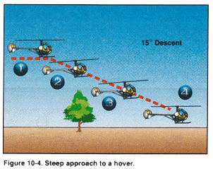 A Steep Approach is used primarily when there are obstacles in the approach path that are too high to allow a normal approach. A steep approach permits entry into most confined areas and is sometimes used to avoid areas of turbulence around a pinnacle. An approach angle of approximately 15 degrees is considered a steep approach.