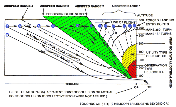 In airspeeds of range 2 to midpoint of range 3 note that a slight change of airspeed results in a large selection in rates of descent. Therefore, this is the best precision airspeed glideslope. A pilot in steady-state autorotative flight in this airspeed range may advance or retreat the point of ground contact noticeably by increasing or decreasing the airspeed by as Little As 5 Knots. Airspeeds of less than 2 yield increasingly high rates of descent.