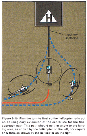 On final approach, at the recommended approach airspeed and at approximately 300 feet AGL, align the helicopter with the point of intended touchdown. After intercepting an approach angle of 8 - 12 degrees, begin the approach by lowering the collective sufficiently to get the helicopter decelerating and descending down the approach angle. With the decrease in the collective, the nose tends to pitch down, requiring aft cyclic to maintain the recommended approach airspeed attitude. Adjust the antitorque pedals, as necessary, to maintain longitudinal trim. You can determine the proper approach angle by relating the point of intended touchdown to a point on the helicopter windshield. The collective controls the angle of approach. If the touchdown point seems to be moving up on the windshield, the angle is becoming shallower, necessatating a slight increase in collective. If the touchdown point moves down on the windshield, the approach angle is becoming steeper, requiring a slight decrease in collective. Use the cyclic to control the rate of closure or how fast you are moving toward the touchdown point. Maintain enrty airspeed until the apparent groundspeed and rate of closure appear to be increasing. At this point, slowly begin decelerating with slight aft cyclic, and smoothly lower the collective to maintain approach angle. Use the cyclic to maintain a rate of closure equivalent to a brisk walk. |