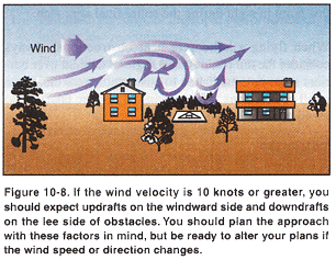There are several things to consider when operating in confined areas. One of the most important is maintaining a clearance between the rotors and obstacles froming the confined area. The tail rotor deserves special consideration because, in some helicopters, you cannot always see it from the cockpit. This not only applies while making the approach, but while hovering as well. Another consideration is that wires are especially difficult to see; however their supporting devices, such as poles or towers, server as an indication of their presance and approximate height. If any wind is present, you should also expect some turbulence. |