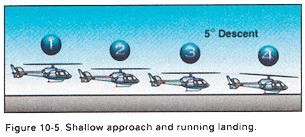 Use a Shallow Approach and Running Landing when a high-density altitude or a high gross weight condition, or some combination thereof, is such that a normal or steep approach cannot be made because of insufficient power to hover. To comphensate for this lack of power, a shallow approach and running landing makes use of effective translational lift (ETL) until surface contact is made. If flying a wheeled helicopter, you can also use a roll-on landing to minimize the effect of downwash. The glide angle for a shallow approach is approximately 5 degrees. Since the helicopter will be sliding or rolling to a stop during this maneuver, the landing area must be smooth and long enough to accomplish this task.